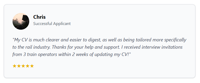 Don't be part of the 70-90% rejected at CV stage. Get your CV reviewed by experienced railway recruiting managers.